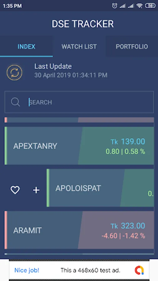 A. INDEX: When user runs DSETracker, latest stock quotes from DSE server is shown in this tab. Pressing the Refresh button retrieves latest price. Swipe a stock right to get the 'Favourites' button, pressing that would add the index to WATCH LIST.