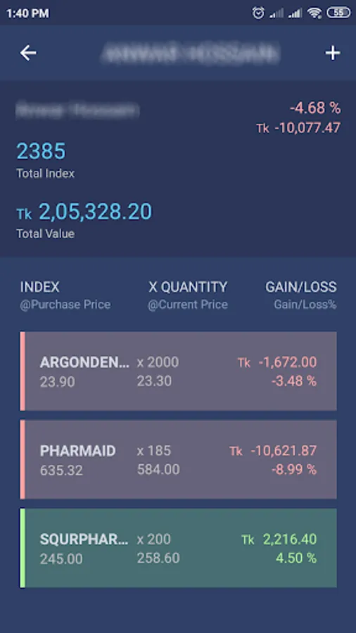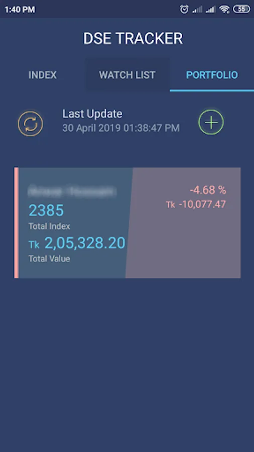 C. PORTFOLIO: Users can manage their DSE portfolio here. The app currently allows multiple portfolio to be managed. Pressing '+' button from INDEX page or WATCH LIST page - user can add any index in the portfolio. Refresh button will recalculate portfolio current value & gain/loss.