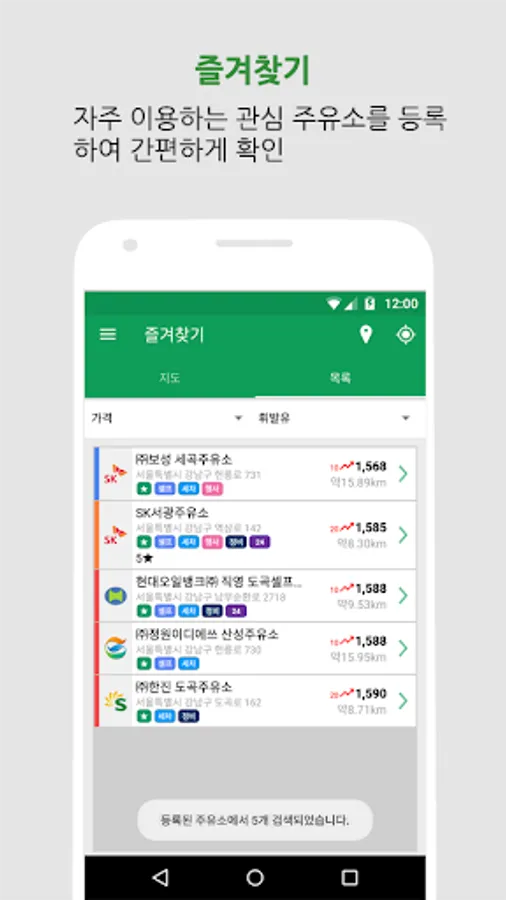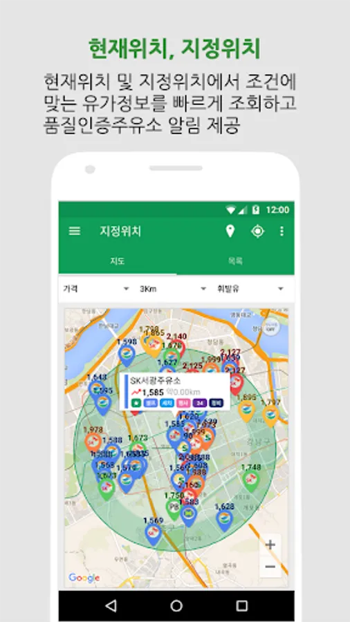 • The current location and radius are displayed on the map, and an extension line (dotted line) is displayed between the current location and the selected gas station (charging station), allowing for more convenient mutual understanding of each other's location. In addition, the distance, price, and name are displayed for each gas station location, which is convenient.