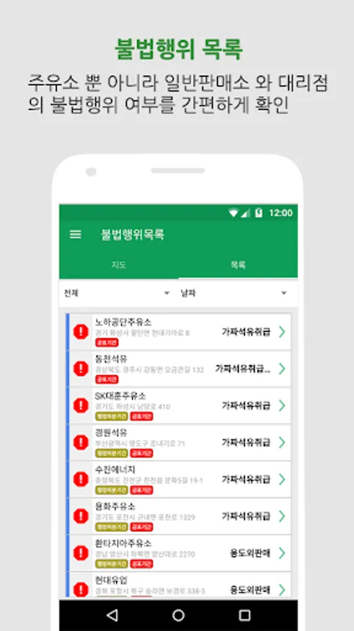 • In Illegal Act mode, you can check illegal acts (fake oil, under-quantity, etc.) gas stations and general sales offices. In addition, it is very convenient to check by displaying black, red, and gray icons depending on whether registration cancellation, administrative disposition period, and publication period are valid or expired.