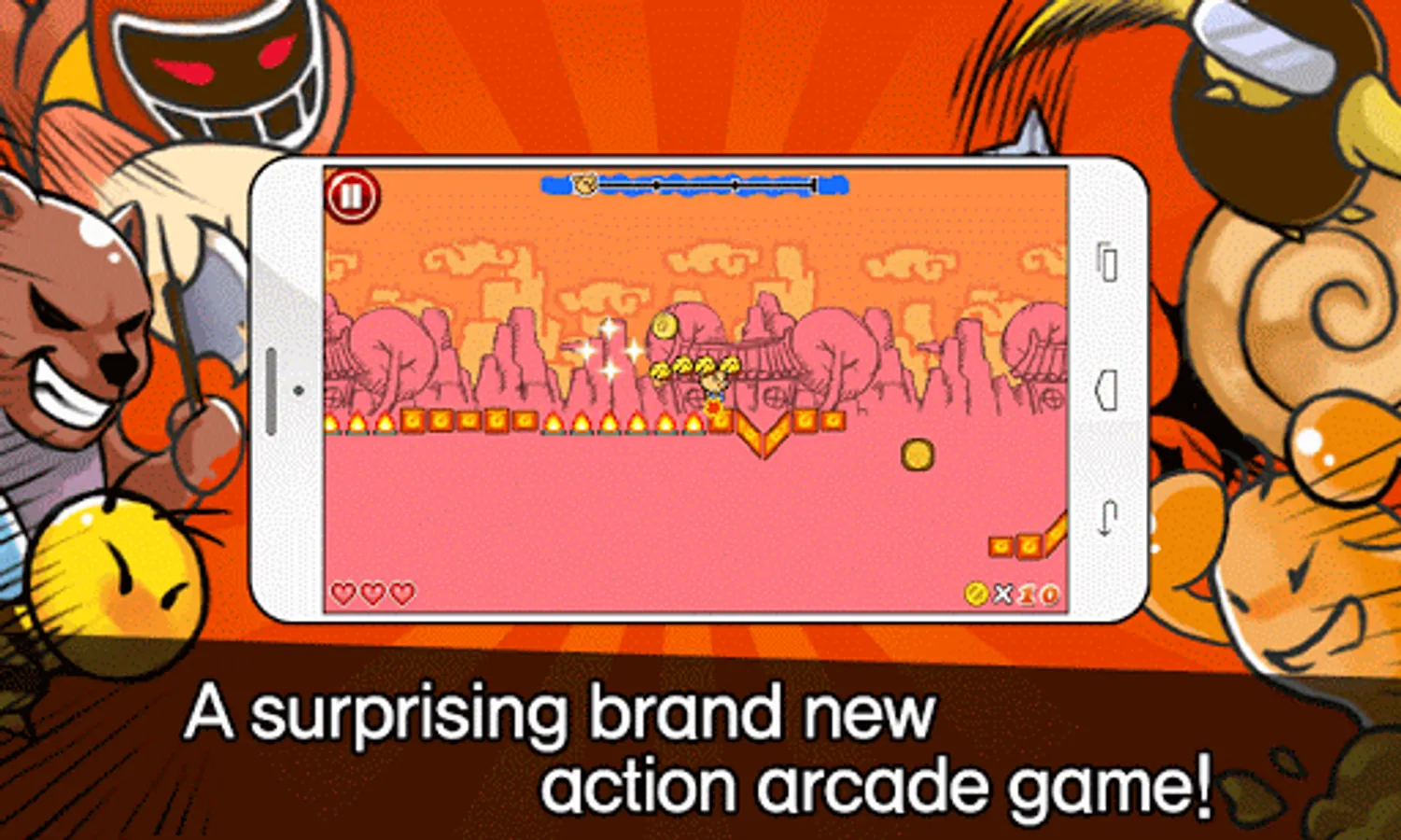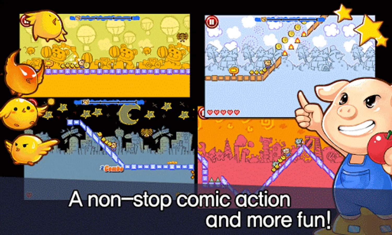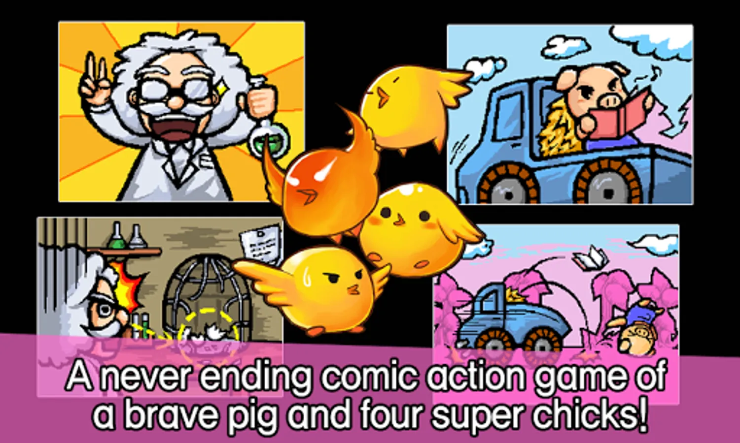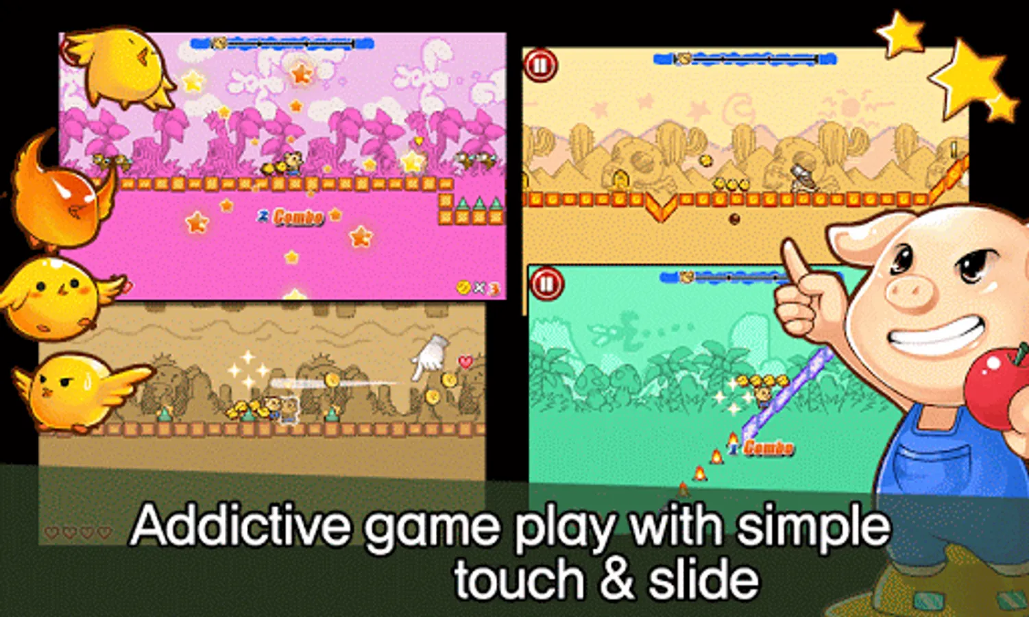 Introducing a comic action game using simple touch & slide to pass obstacles!! A trouble making pig and very cool super chicks will bring fun for you!!