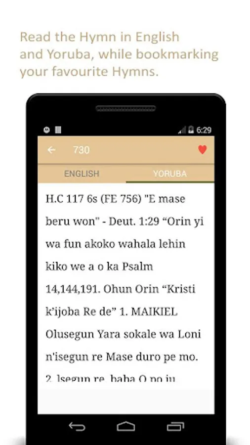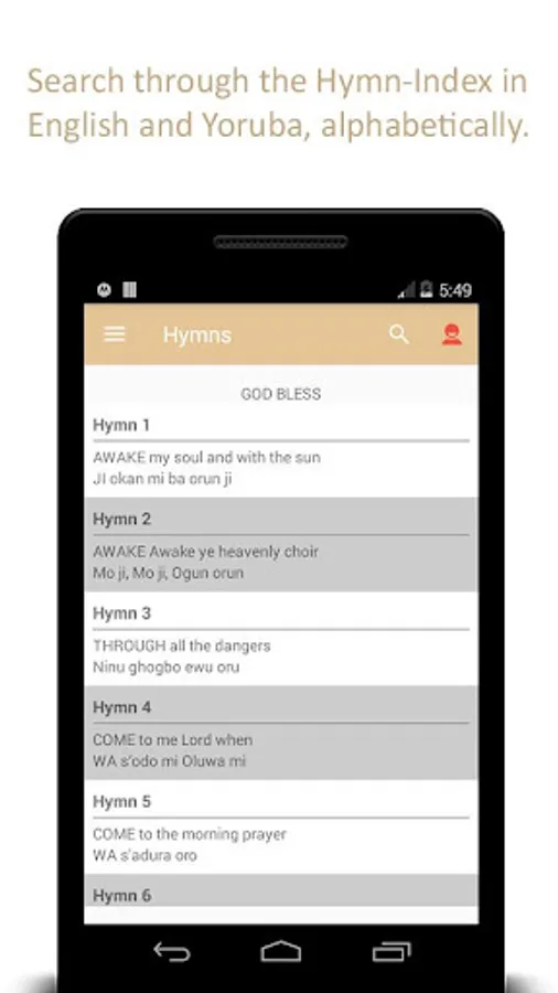 * Easily select and SEARCH THROUGH hundreds of HYMNS with EASE – By Index, Hymn’s or Category; all in Yoruba & English.