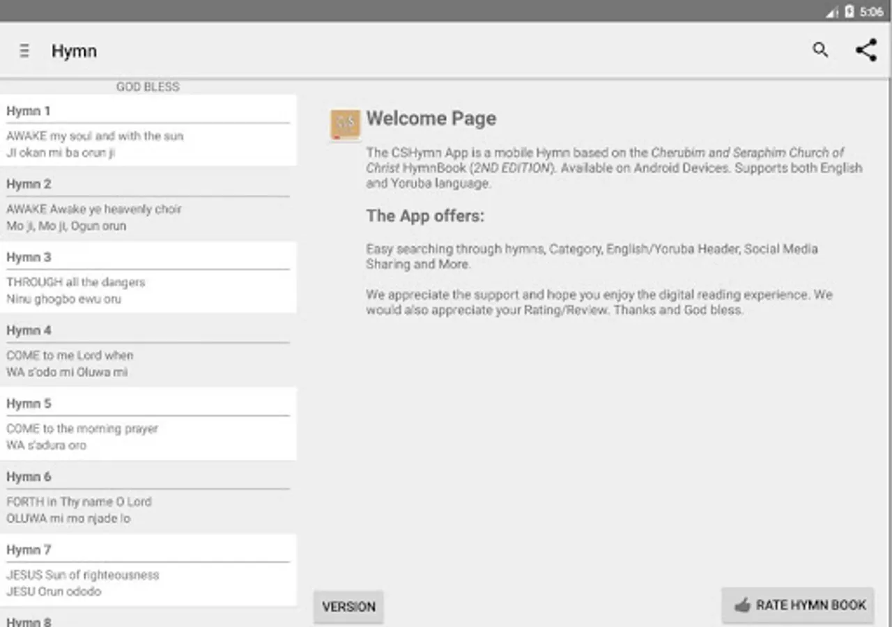 The App is a mobile Hymn based on the Cherubim and Seraphim Hymn Book – 2ND Edition. Available on Tablet and Handset; supports both English and Yoruba language. The App offers easy searching through hymns, categories, favourites, Index, social sharing, and more.