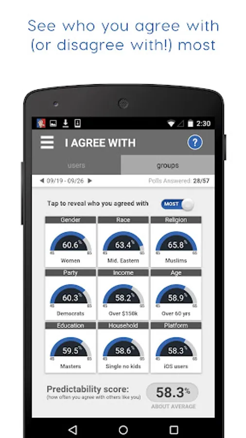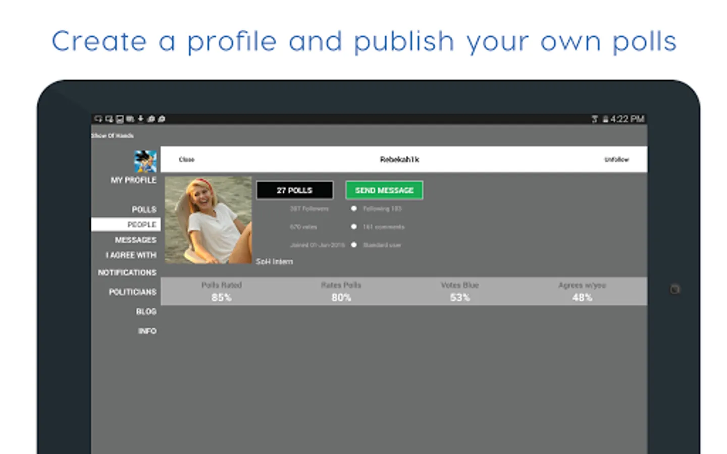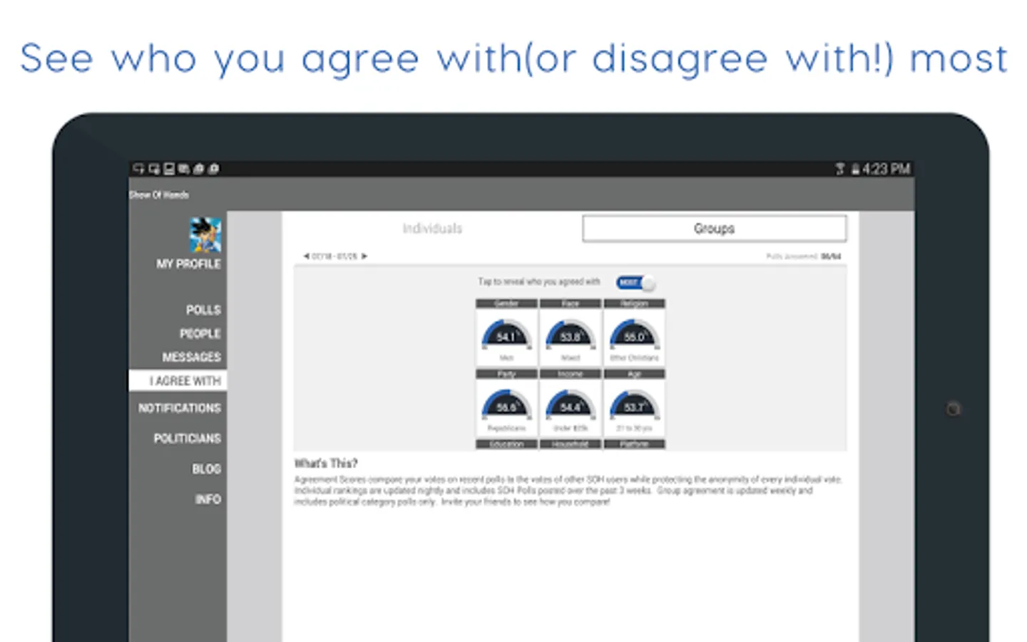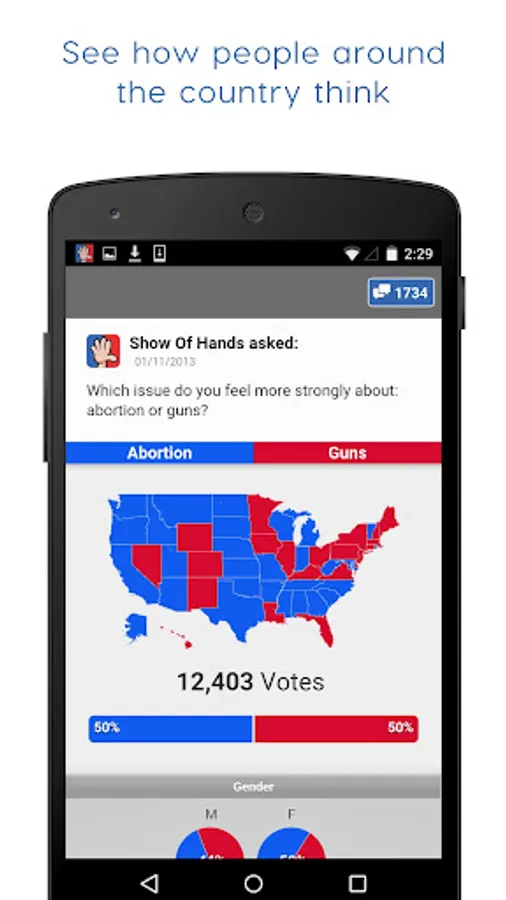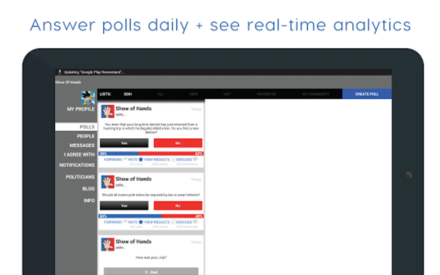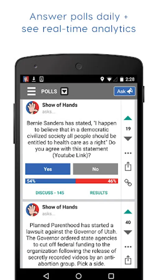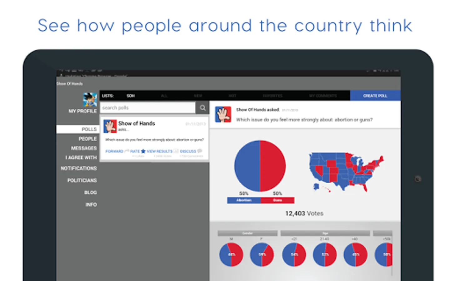 Show of Hands is a smart and fun community polling platform for people who love burning questions! Answer new questions daily and see instant, real-time, anonymous results from fellow brilliant minds around the country. This information is broken down by age, religion, income, and more! (You can just think of us as your national level town hall.)