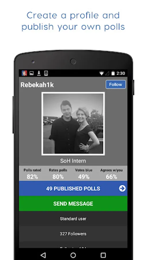 Do YOU have questions!? Have you ever been having drinks with friends-- or even just around the water cooler with coworkers-- and gotten their opinions and comments on something? Do you ever feel like their vote is just plain wrong?! (How could zombies NOT BE REAL?) Or not telling the whole truth!? (Please, everyone takes their phones into the bathroom.) Build an anonymous Show of Hands following and publish your own polls to test if your opinion is in the majority! Ask your own questions about politics, ethics, pop-culture, humor, sports, health, news-- or anything else your brain can think of!