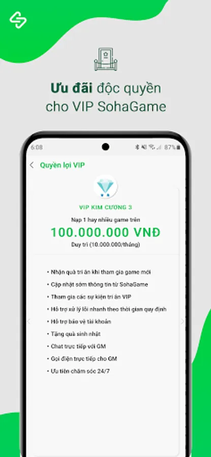 - Get a VIP promotion when you load the game. Each VIP class will have its own milestone to load requirements with a series of extremely attractive benefits such as: weekly / monthly code gift, gratitude gifts, birthday gifts, exclusive information updates early from SohaGame ...