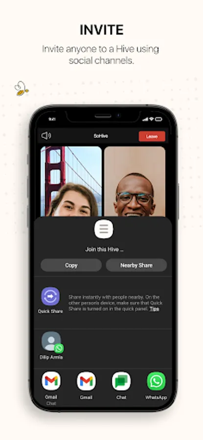Group and Open Hives are continuously open 24x7, and support up to 300 people in each Hive, so you can always be with someone. Change Hives as often as you like. Live chat is available to chat with specific people in each Hive, or “All” attendees. You can mute your audio, turn your video on or off, and add a personalized background. SoHive utilizes Zoom for video, so you likely already know how to use all the video features. Invite friends and family through the integrated invite feature, which connects to your Instagram, WhatsApp, Facebook, and Gmail. When you are in a Hive and send an invite, it offers your family, friends and customers the ability to join the specific Hive you are in with a single tap.