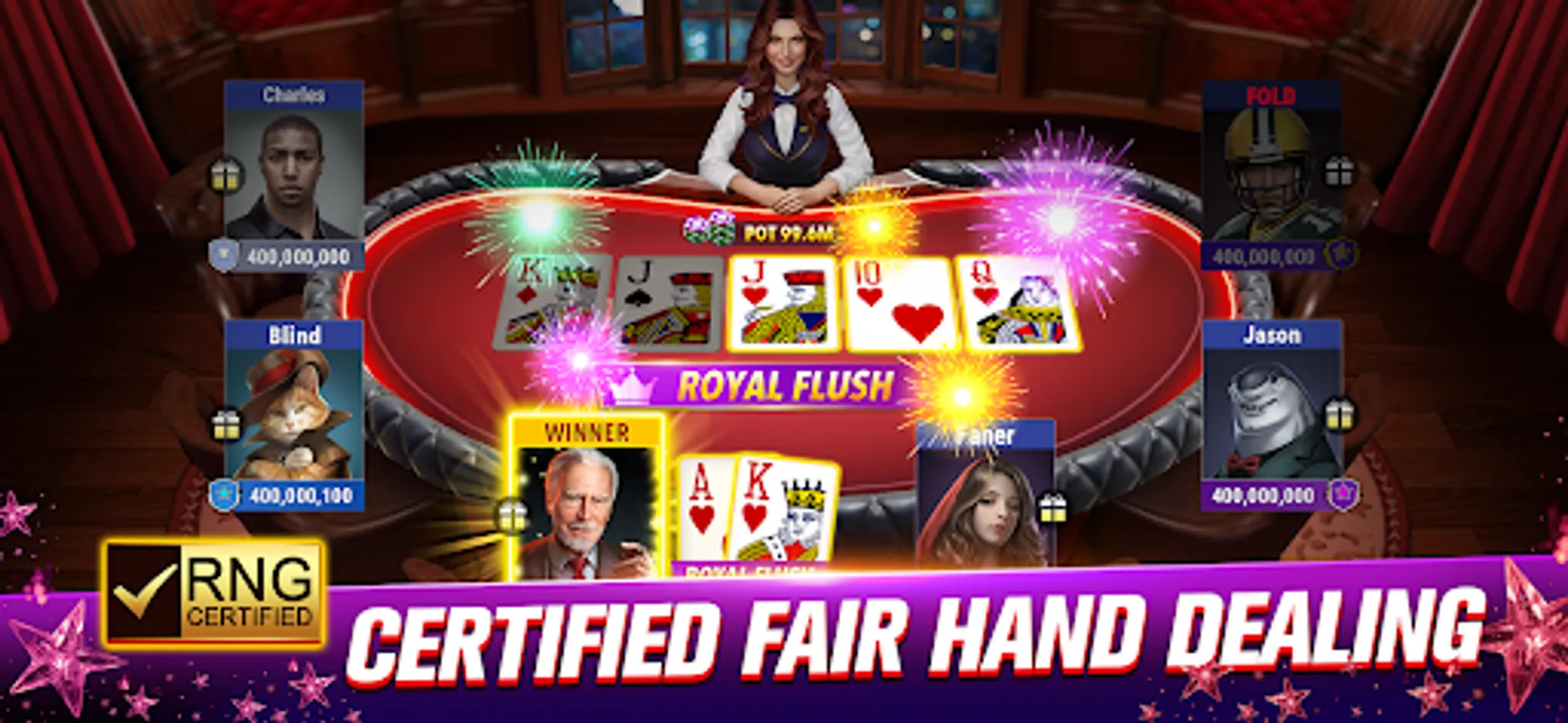 • Poker Sponsors: Our hold’em poker game has a lot of sponsors, including brands like Poker Master, Mega Billion, City Poker Tour, Shark Poker, and more.