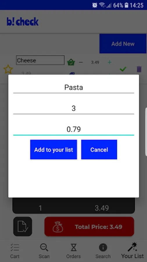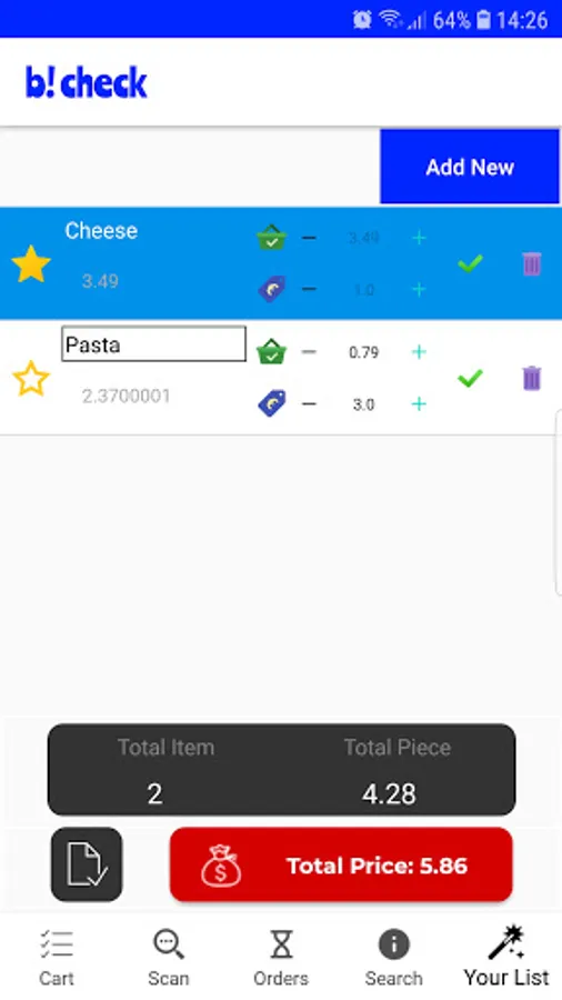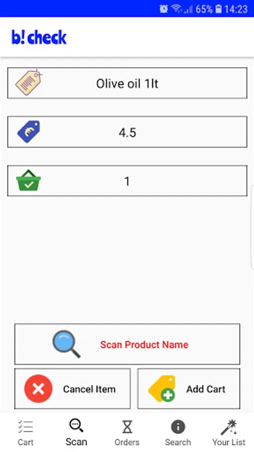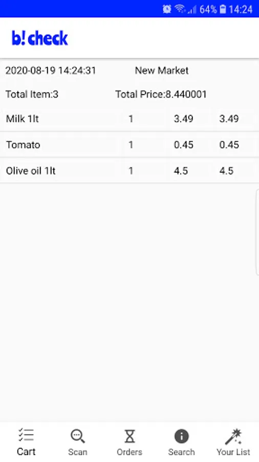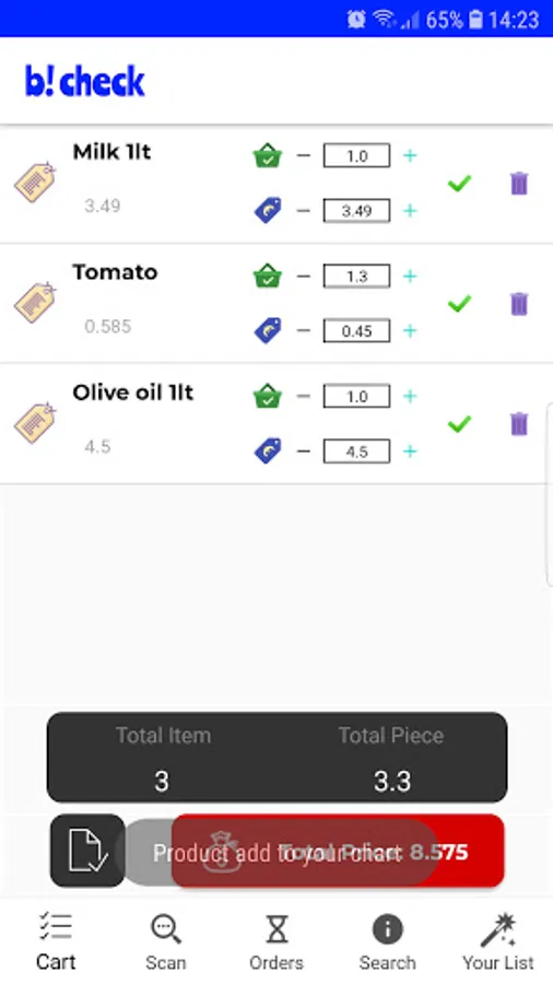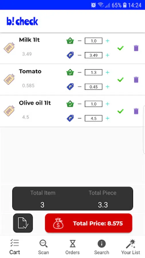 With bi check, you can check how much you spent while shopping and how many you bought.