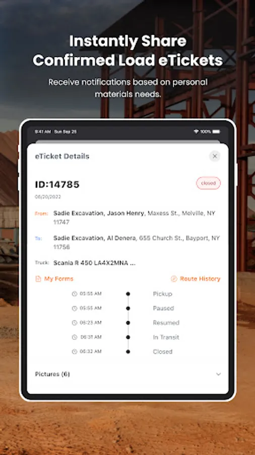 Companies will want to use this service instead of using paper tickets for the moving of dirt, aggregates and other materials from one location from/to their jobsite. Admins can create tickets, schedule drivers, and get invoices done faster. Drivers are able to take pictures of the materials at pick up and delivery, request eSignatures and share completed tickets.