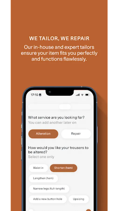 Our in-house tailors are committed to expertly transforming your clothes into something new or repairing them to what once was. Meanwhile, our friendly riders collect and deliver your item to your door in a few simple clicks.