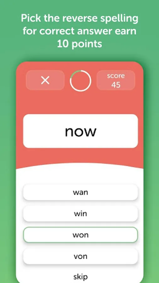 1) Levels game where you look for the reverse spelling of the word in the options. Time and number of words are limited, you have to find all the reverse spellings to succeed in the level. Read it carefully not to get tricked by misspelled words.