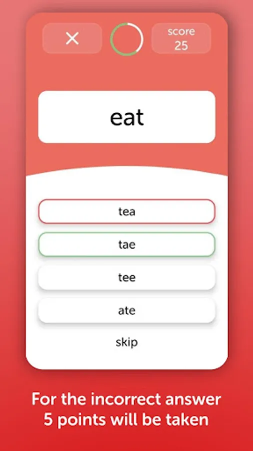 2) Custom game in which for every correct reverse spelling you earn 1 point, for incorrect -1 point will be taken. The time and number of skips are set by you. After the game is up you will see your final and best score.