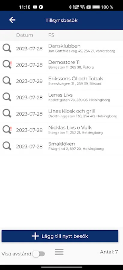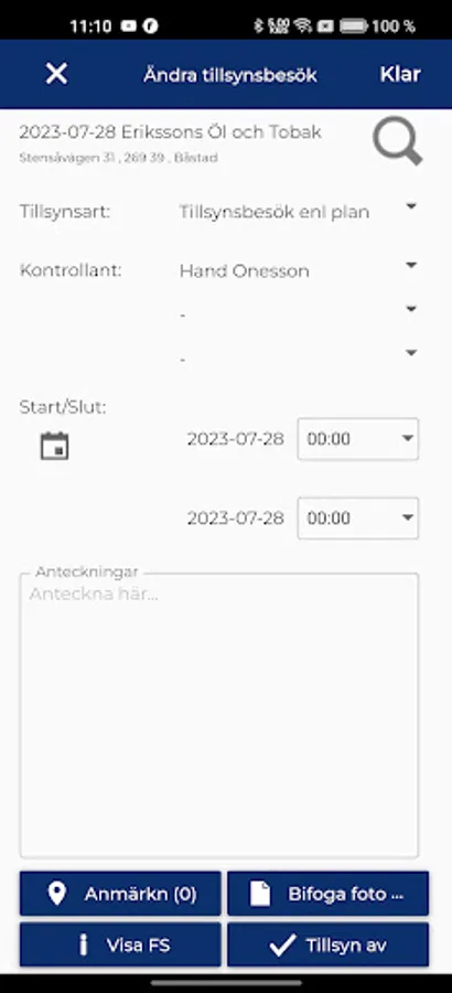 The app communicates with the database via wifi or the mobile network. Date of visit, times, form of supervision, remarks / specifications etc. are registered directly to the business system online. In the same way, you can download information about permits, type of sales and ownership in the app.