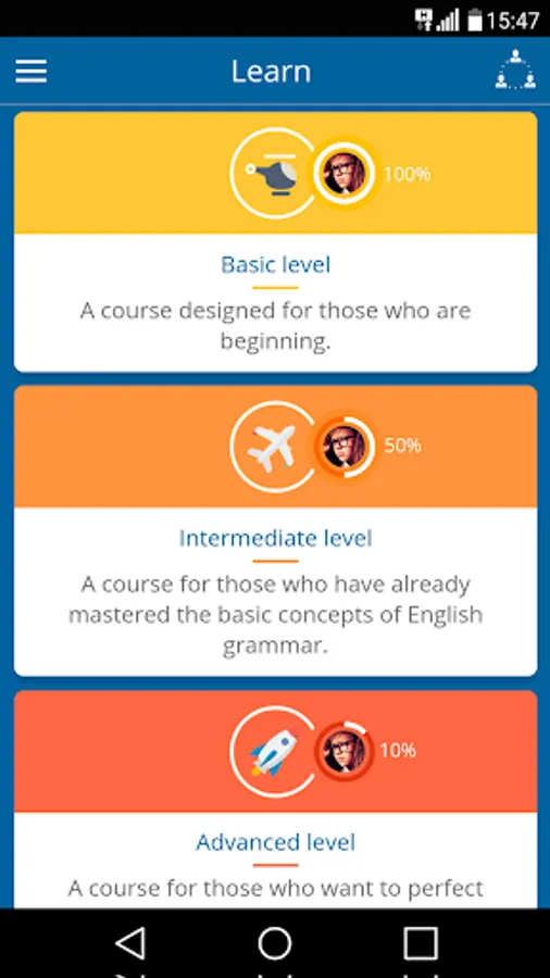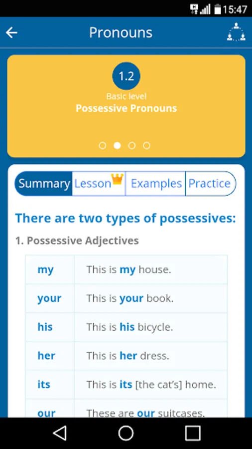 ✔ LEARN: You will find the course organized in different levels where you can study everything from the basic concepts of English grammar to the most advanced. All English grammar simply structured with examples and audio for easy comprehension!
