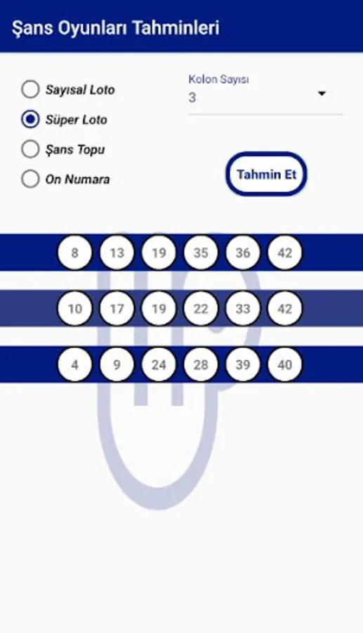 Not : Uygulamanın milli piyango idaresi ile "resmi" olarak bir bağlantısı yoktur. Sadece tahminleri göstermektedir.