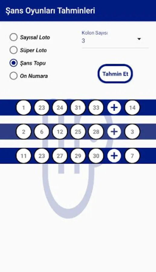 Şans Oyunları Tahmin uygulaması ile Sayısal Loto, Şans Topu, On Numara ve Süper Loto için tahminleri görebilir ve şansınızı arttırabilirsiniz.