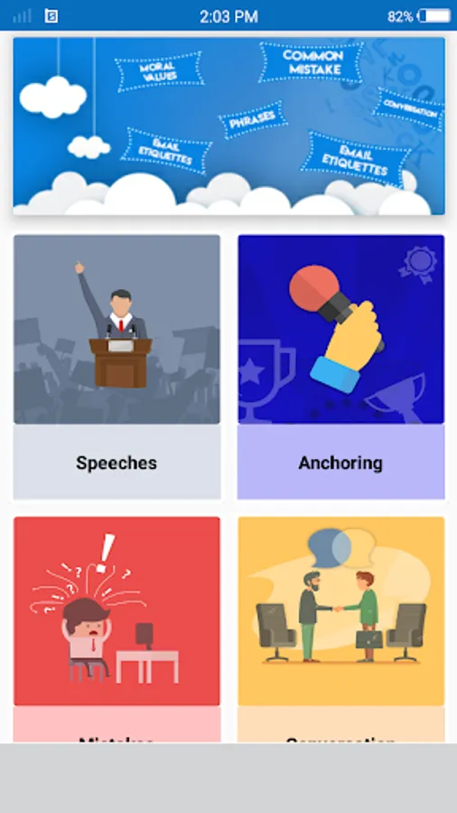 The best app for the most common problems of English. The apps provide you with the best materials to learn English. English speech category has huge collections of English speech also app has different learning categories Idioms, Email ethics, Proverbs, Common mistakes in English, Moral values.