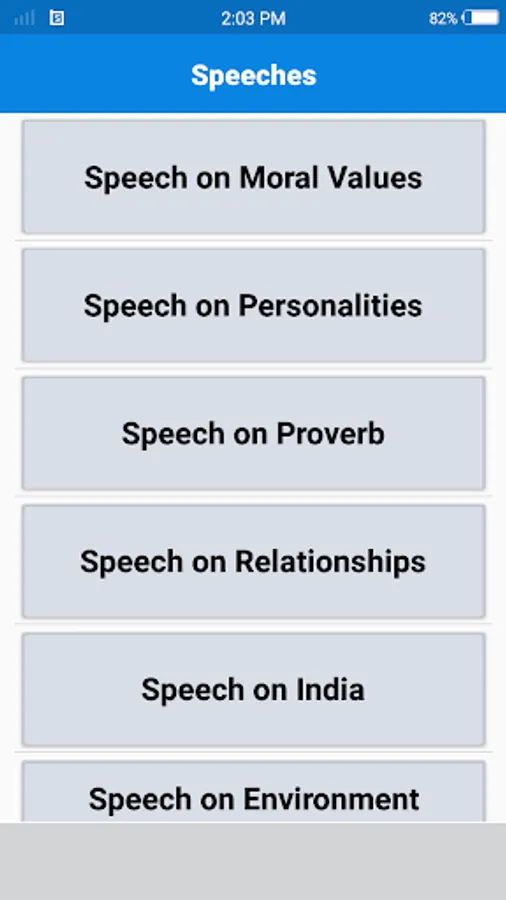 English Speeches App has covered all the speeches like Republic day speech, wedding speech, save trees speech, farewell speech, motivational speech, annual day speech, moral values speech, environmental topics speech.