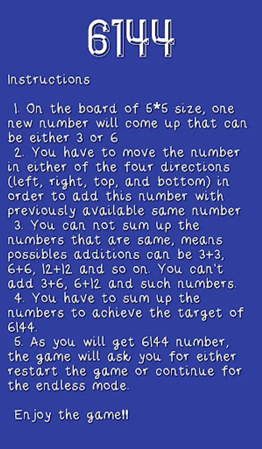 Swipe (Up, Down, Left or Right) to move the tiles. When two tiles with the same number touch, they merge into one. When 6144 tile is created, the player wins!