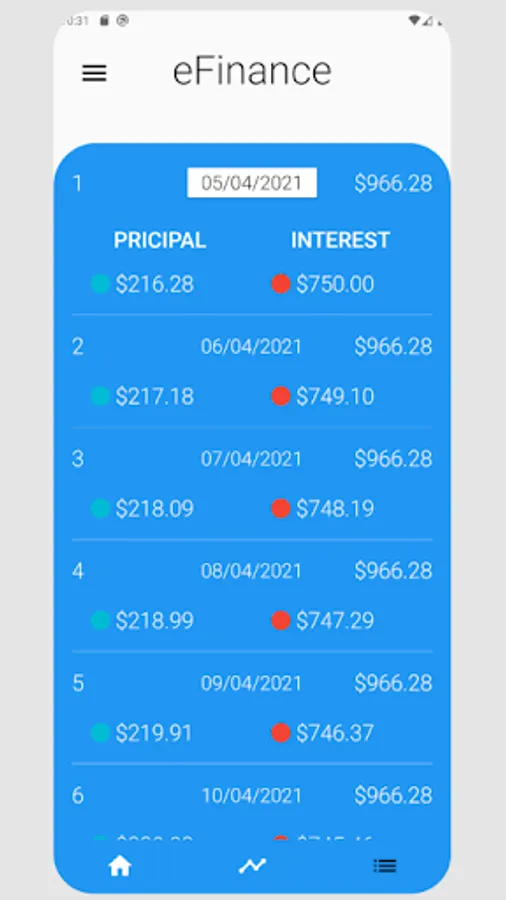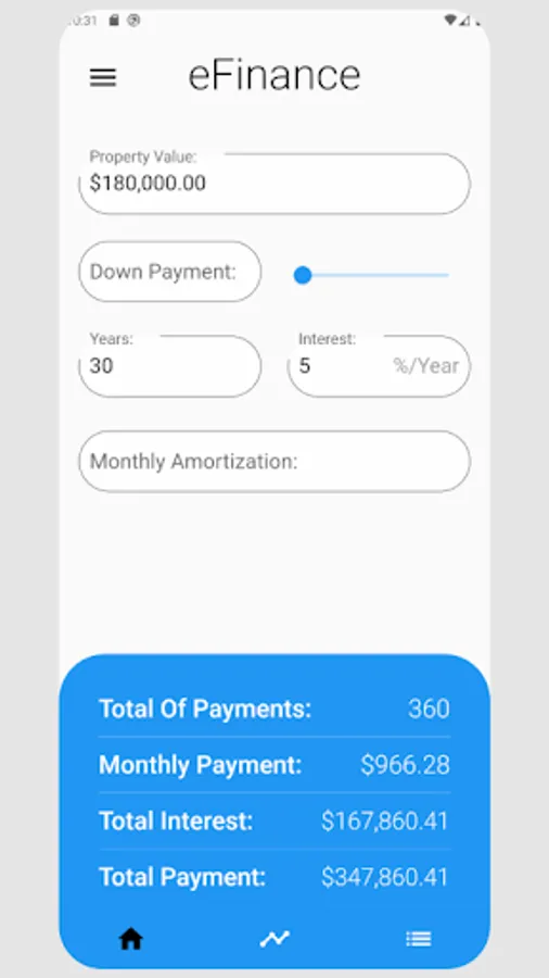 eFinanace is very easy to use, all you have to do is enter the loan amount, interest rate and years of payment, and you will get all the details about mortgage payments.