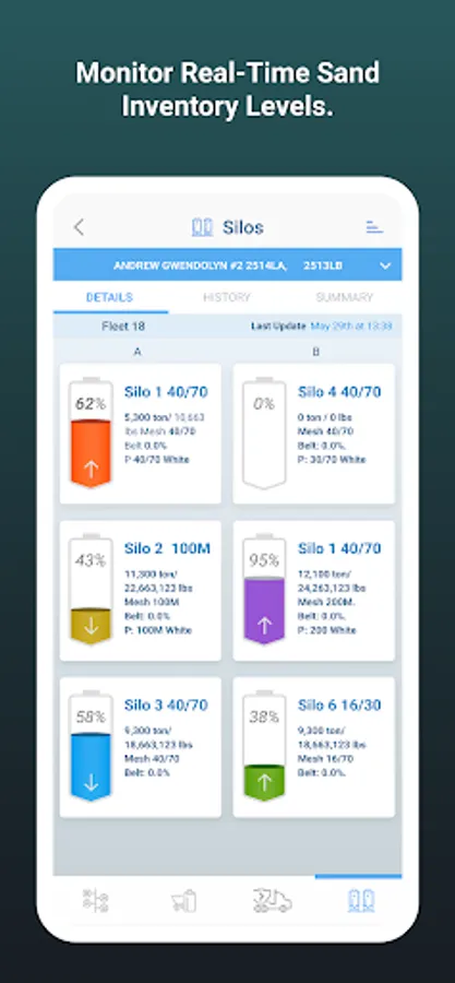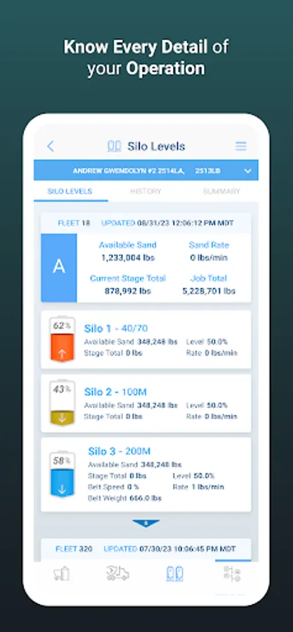 Well Site Monitoring – Keep track of sand levels and throughput within of Solaris Mobile Proppant Management Systems.