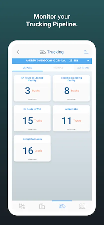 Trucking – View truck information associated to your well site, including trucks en route to loading, trucks loading, trucks en route to well site, and trucks at well site.