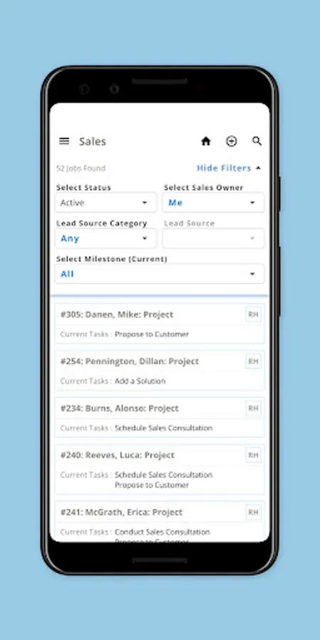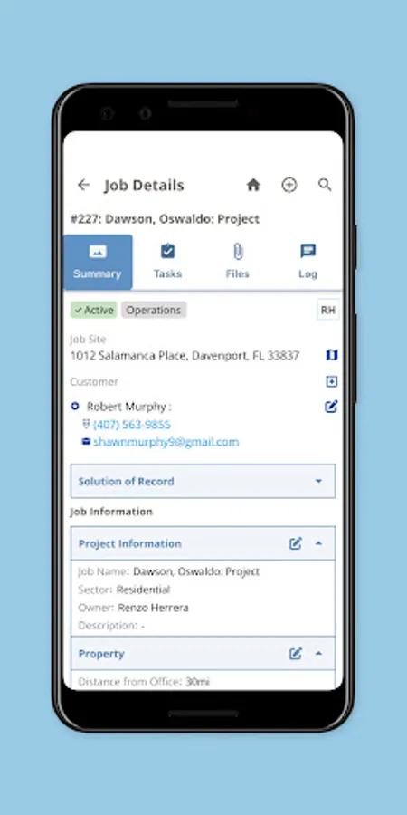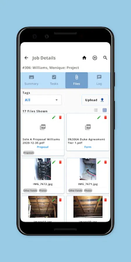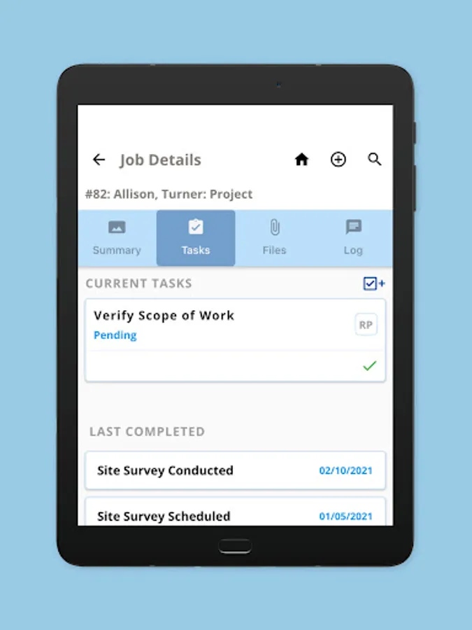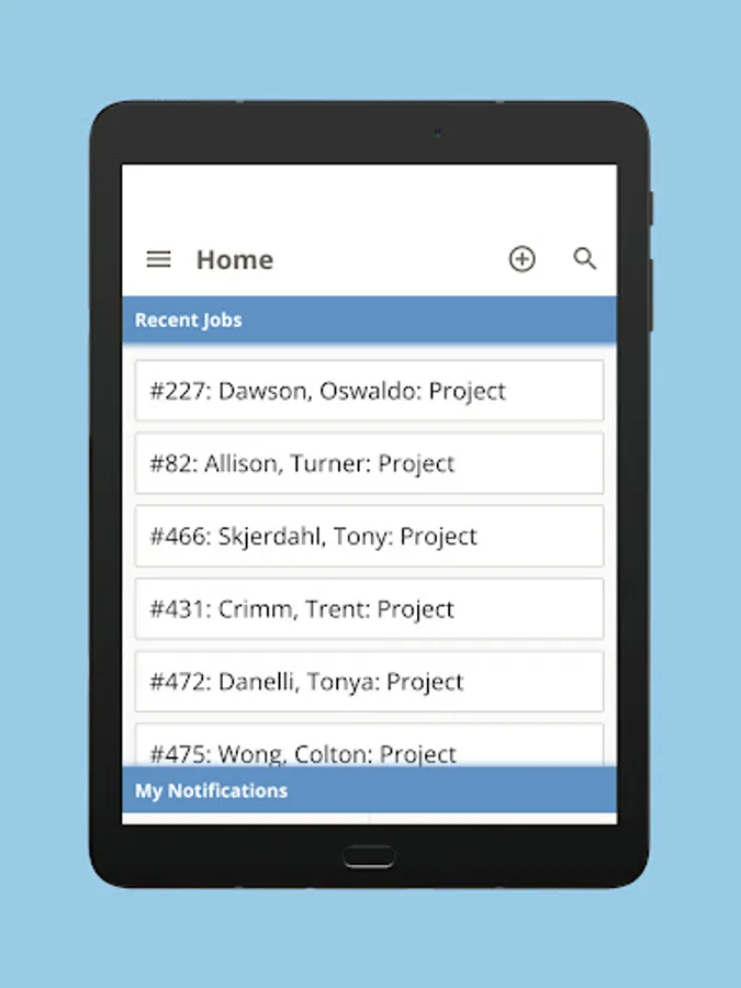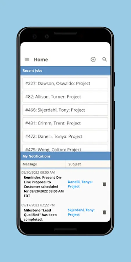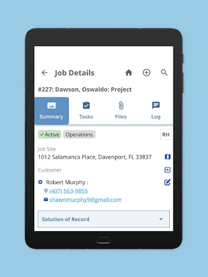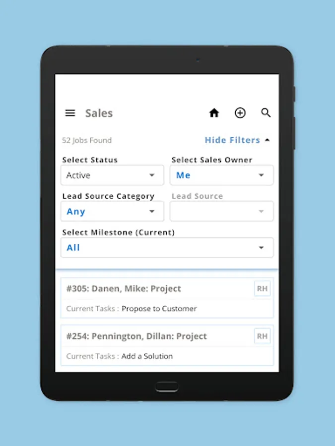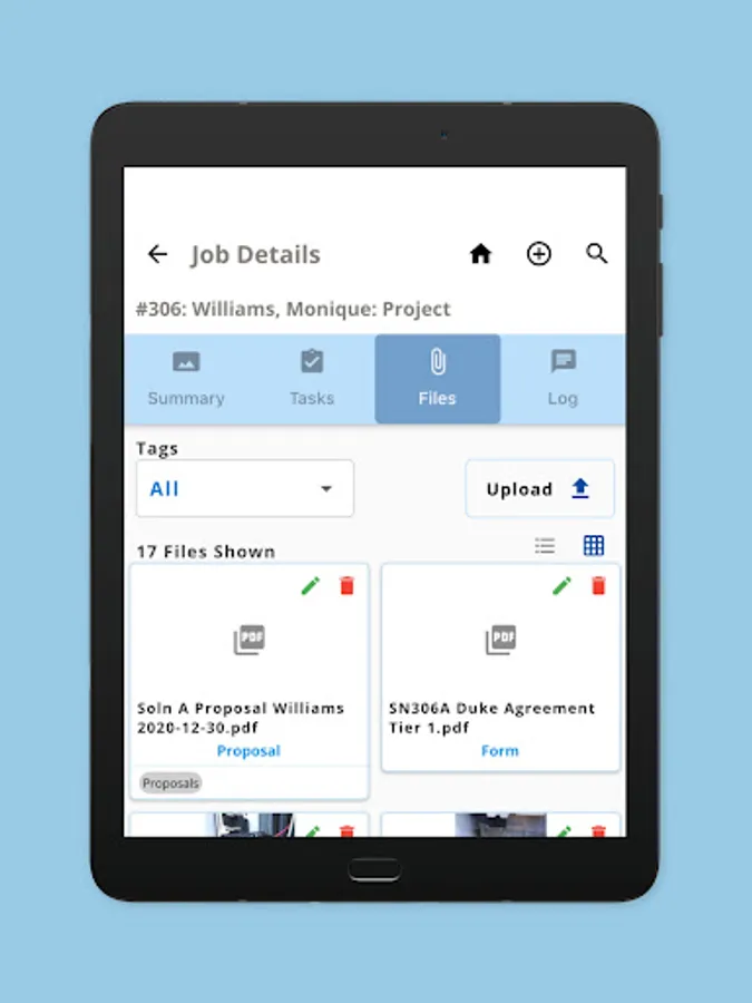 The Mobile App provides rapid access to customer and job information, including contact details, job notes, status/milestone information, and attached files and photos. You can also add new leads, and update any job's status, add notes, or upload new photos or documents in the field.