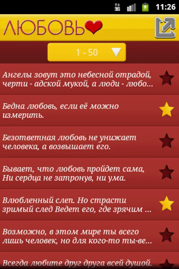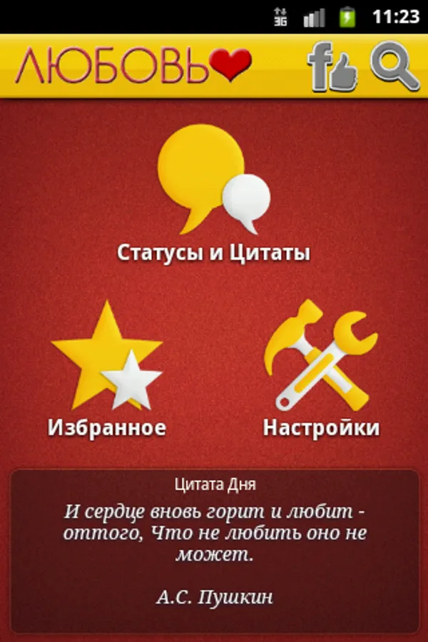 Our collection is constantly updated with new quotes, wise aphorisms and Funny statuses about love. By installing this application, you can better convey their thoughts and feelings. Make a loved one to listen more attentively to your words.