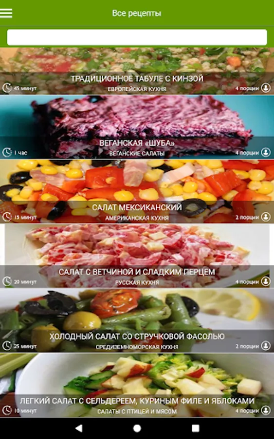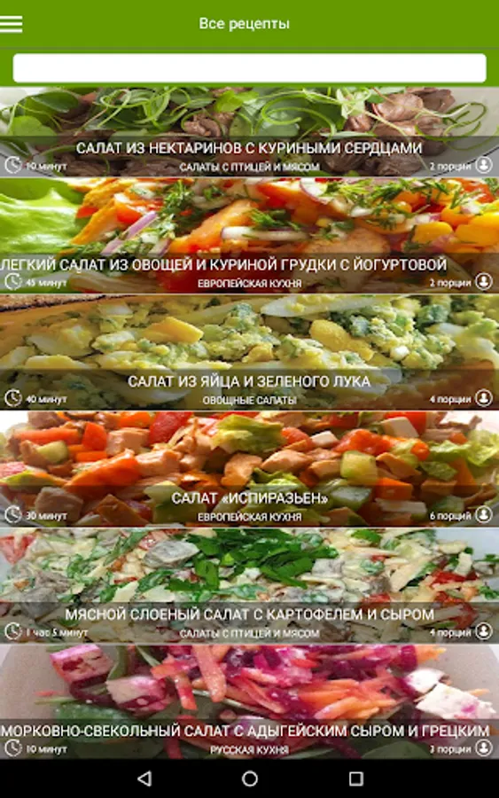 This application contains the best recipes for simple dietary salads that do not require special cooking skills and time-consuming. All of them are prepared quickly and mostly from fresh vegetables. Among other things, many easy-to-prepare salads for every day can be used as side dishes for dishes from: meat, fish or poultry. Take advantage of any recipe from our application and you will understand how simple it is, tasty, fast and most importantly useful.