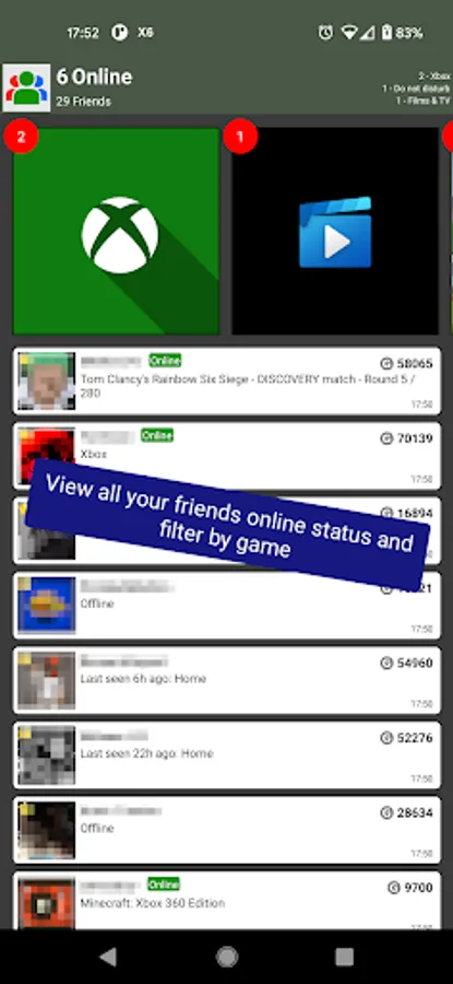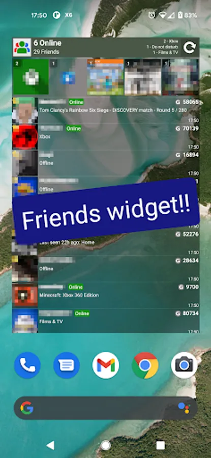My Xbox Friends & Achievements allows you to keep track of your own and your friends online status and achievements in a screen and as a widget. Includes features: