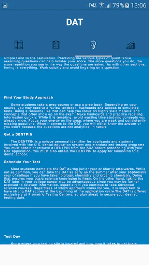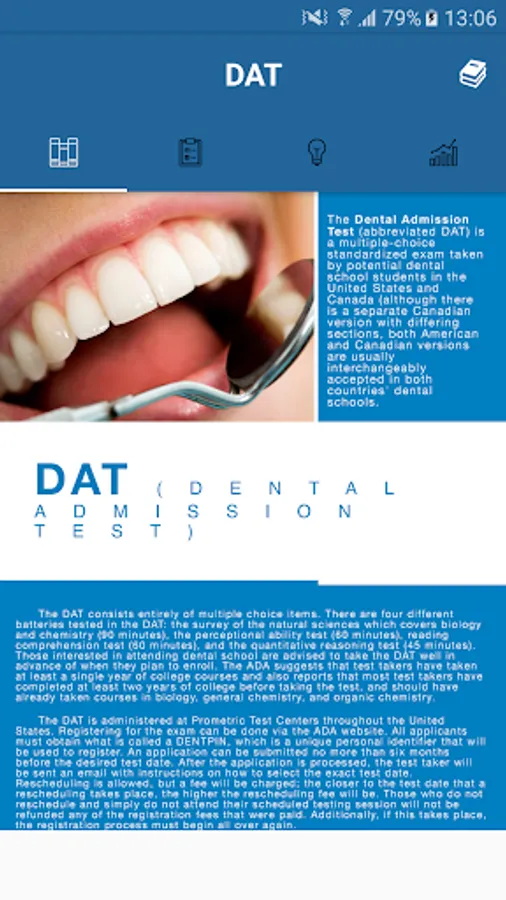 The Dental Admission Test (DAT) is a multiple-choice standardized exam taken by potential dental school students in the United States and Canada. The DAT is a computer based test that can be administered almost any day of the year. Each applicant may only take the test a total of three times before having to ask special permission to take the exam again. After taking the exam you must wait 90 days before repeating it. Each exam costs $415, all of which is non-refundable. Make sure you don't waste your money failing the exam! Practice your knowledge with this app!