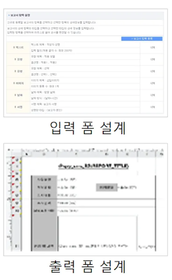 - 분야별 특성에 맞는 스마트폰 현장 점검 입력 화면을 편리하게 구성할 수 있으며, 현장 점검 결과가 입력과 동시 출력형태의 보고서로 자동으로 만들어짐으로 현장 중심의 업무 환경 구현이 가능합니다.