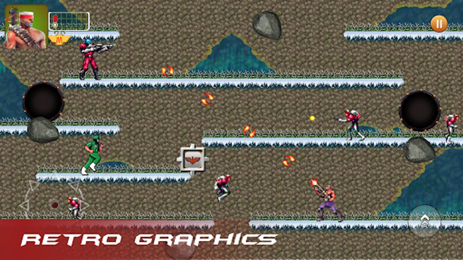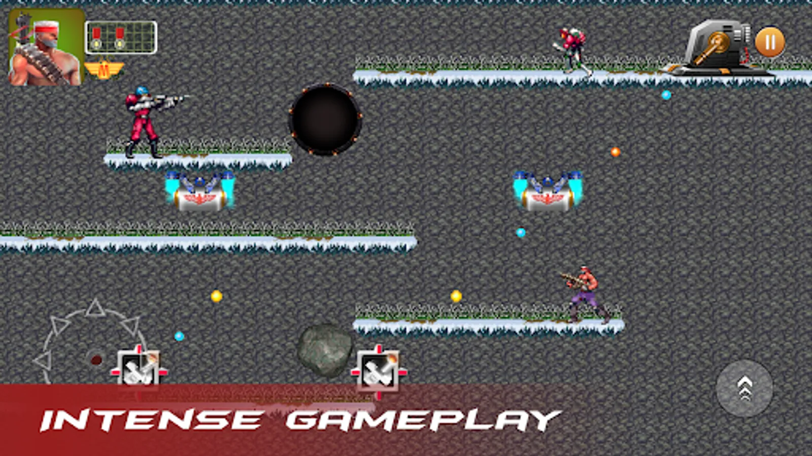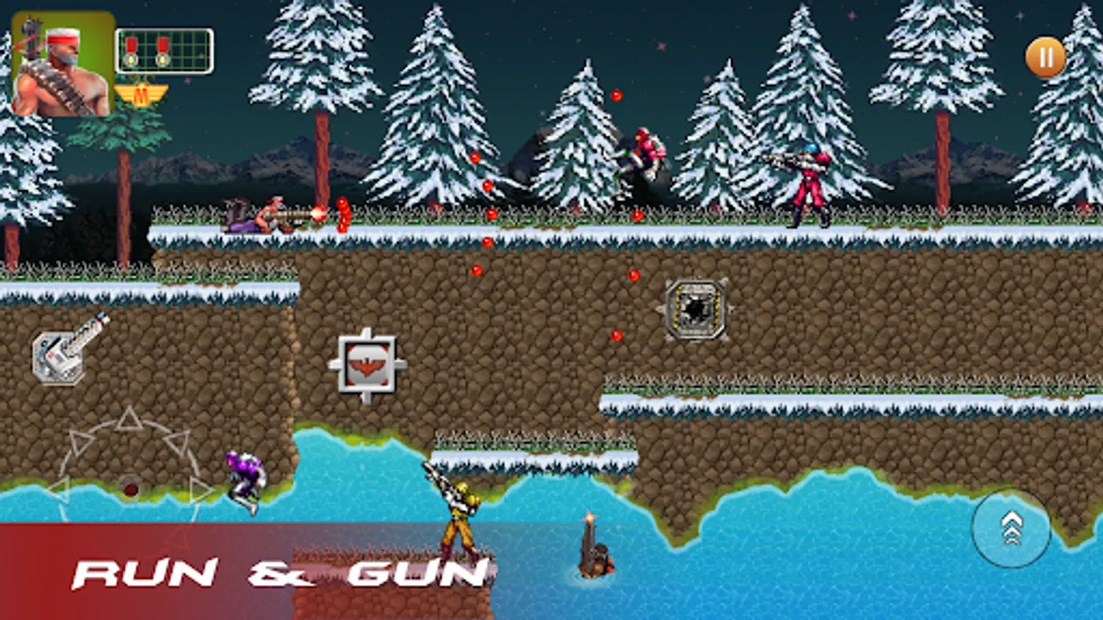 Use virtual controls consists of an eight-way joystick and action button jumping. When soldier jump, he curls into a somersault. The joystick to control soldier's movement and control bullet direction, the soldier can also shoot in any of eight directions, including downwards, while jumping. Pressing the joystick downwards while standing will cause the character to lie down on his stomach, allowing him to avoid enemy fire and shoot low targets. When the jump button is pressed while crouching on a higher platform, the soldier will drop down to a lower ground.