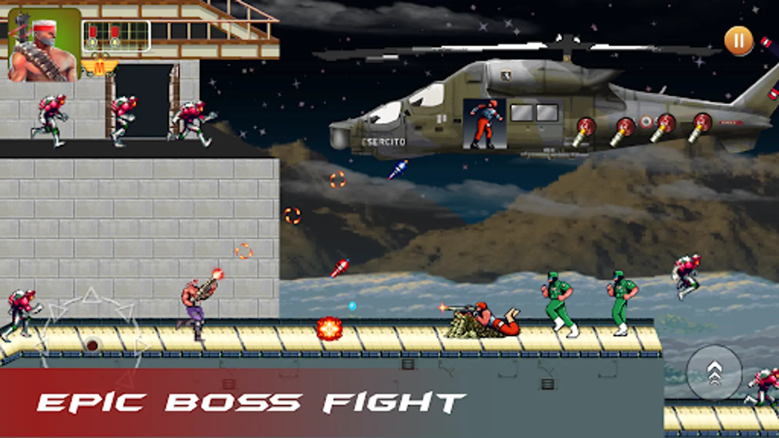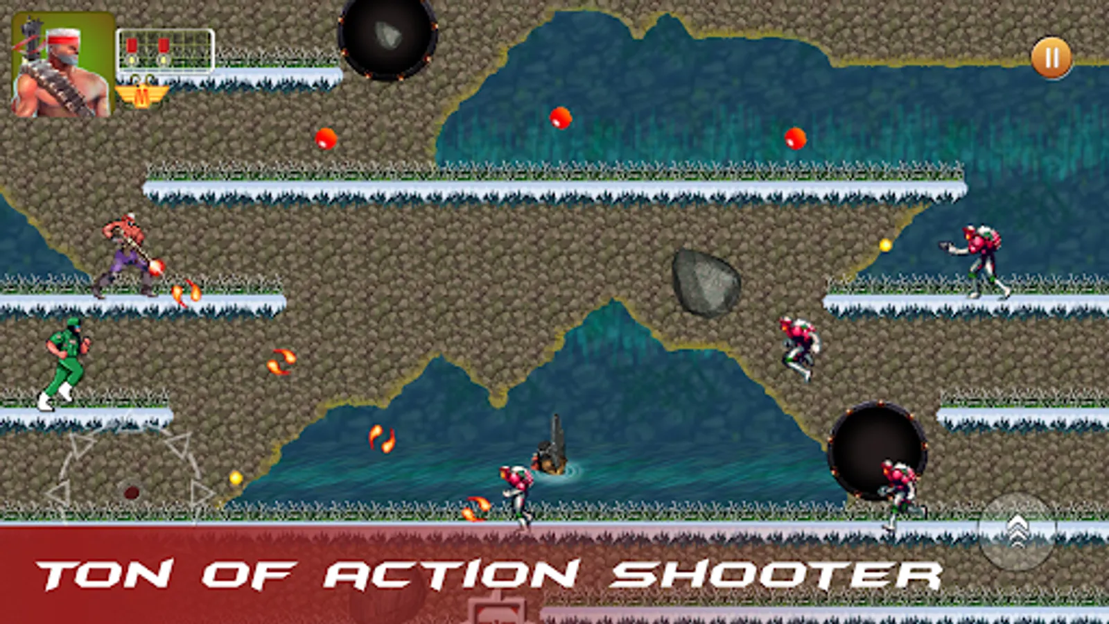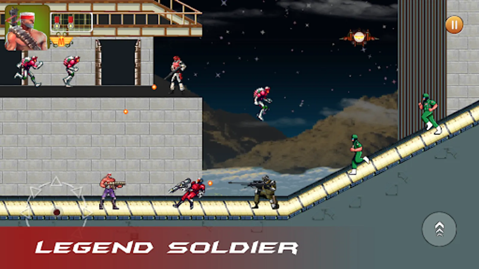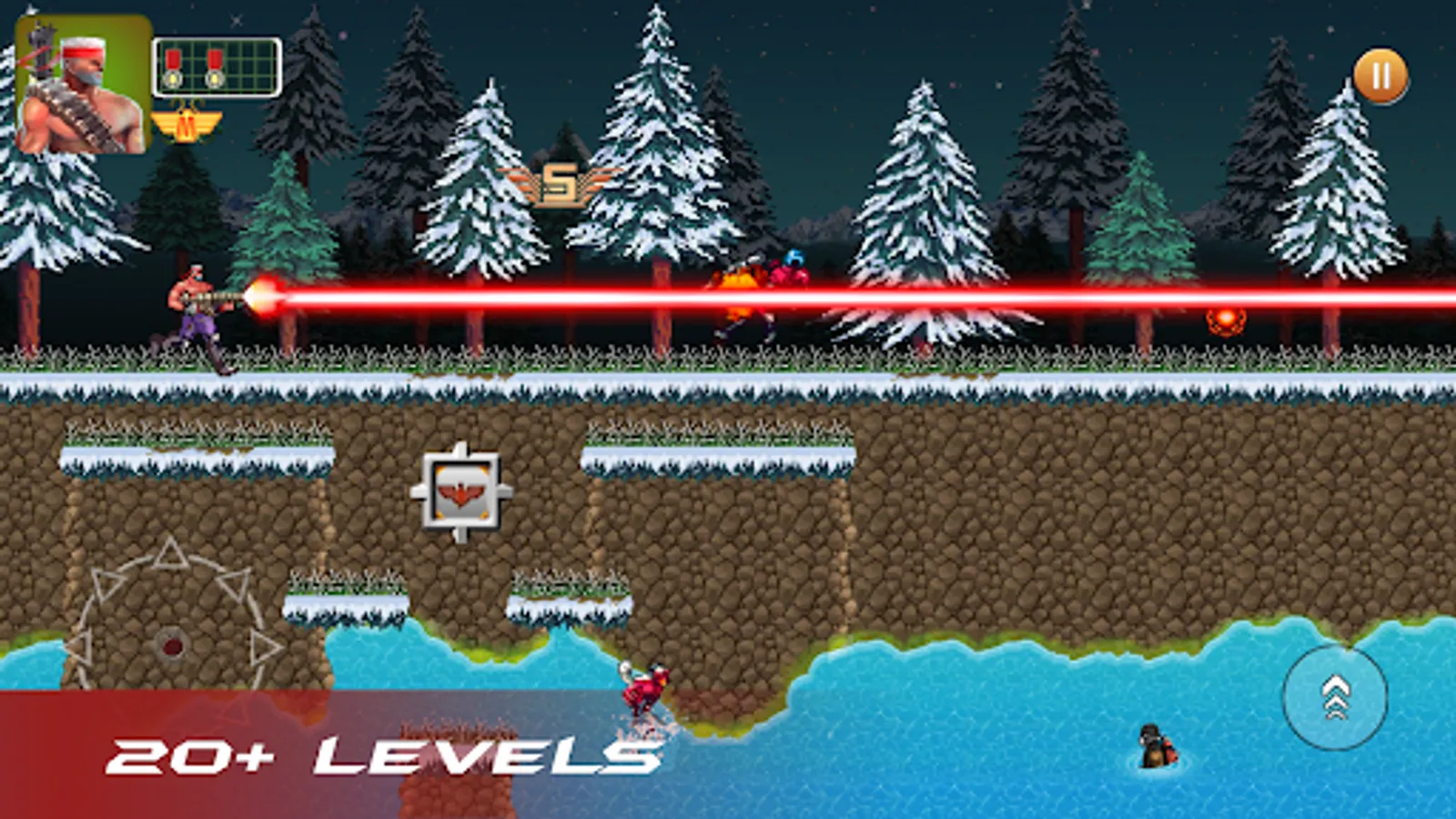 Use virtual controls consists of an eight-way joystick and action button jumping. When soldier jump, he curls into a somersault. The joystick to control soldier's movement and control bullet direction, the soldier can also shoot in any of eight directions, including downwards, while jumping. Pressing the joystick downwards while standing will cause the character to lie down on his stomach, allowing him to avoid enemy fire and shoot low targets. When the jump button is pressed while crouching on a higher platform, the soldier will drop down to a lower ground.