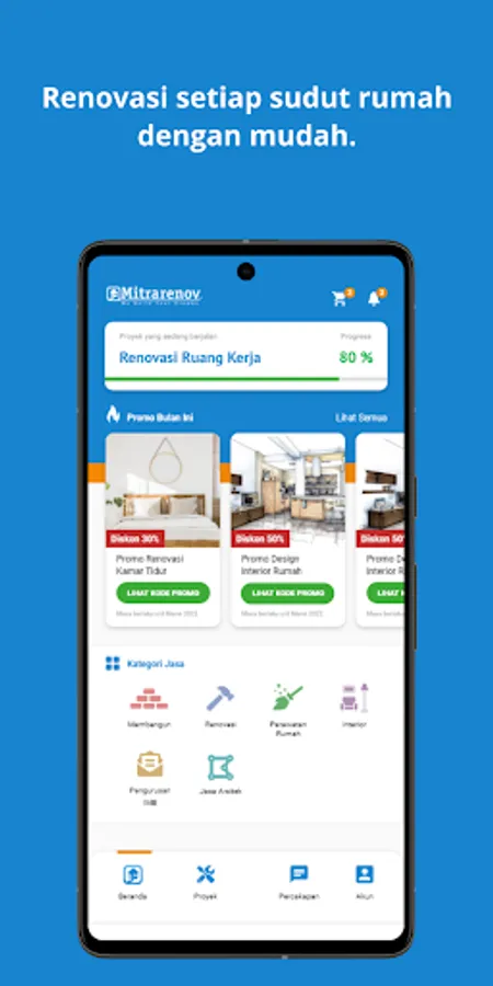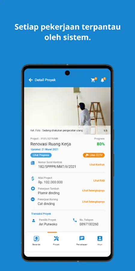 Complicated to have to monitor progress directly every day? Or do not have time because busy working? No need to worry, with the Mitrarenov application you can monitor the development of house construction and renovation anywhere and anytime. With CCTV you can monitor progress in real-time.