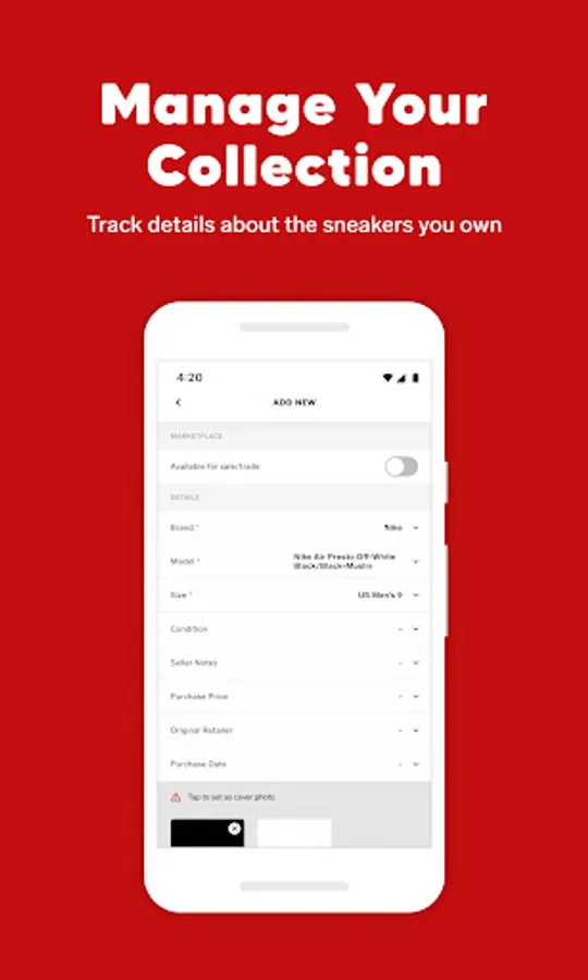 Upload your sneakers, and track details like where, when, and how much you paid