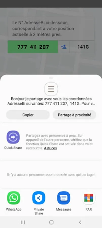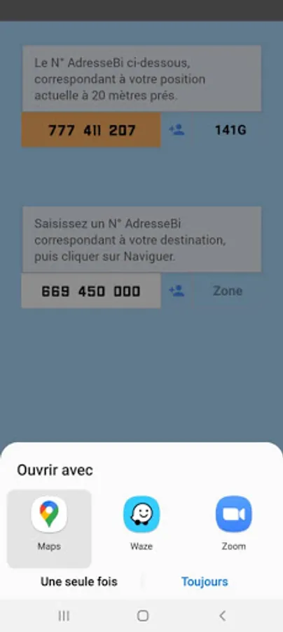 AdresseBi displays in real time the Universal address for your current location or at a point that you choose on the map.