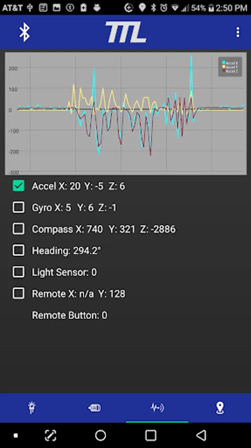 • View live sensor (IMU) measurements in text and on a scrolling graph