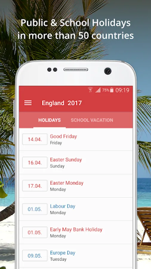 Whether you want to have an overview of your kids school vacations or to be able to guess changes on the traffic density due to public holidays, with our Holidays and Vacations App you will easily access these valuable information for many different countries including popular travel destinations worldwide.
