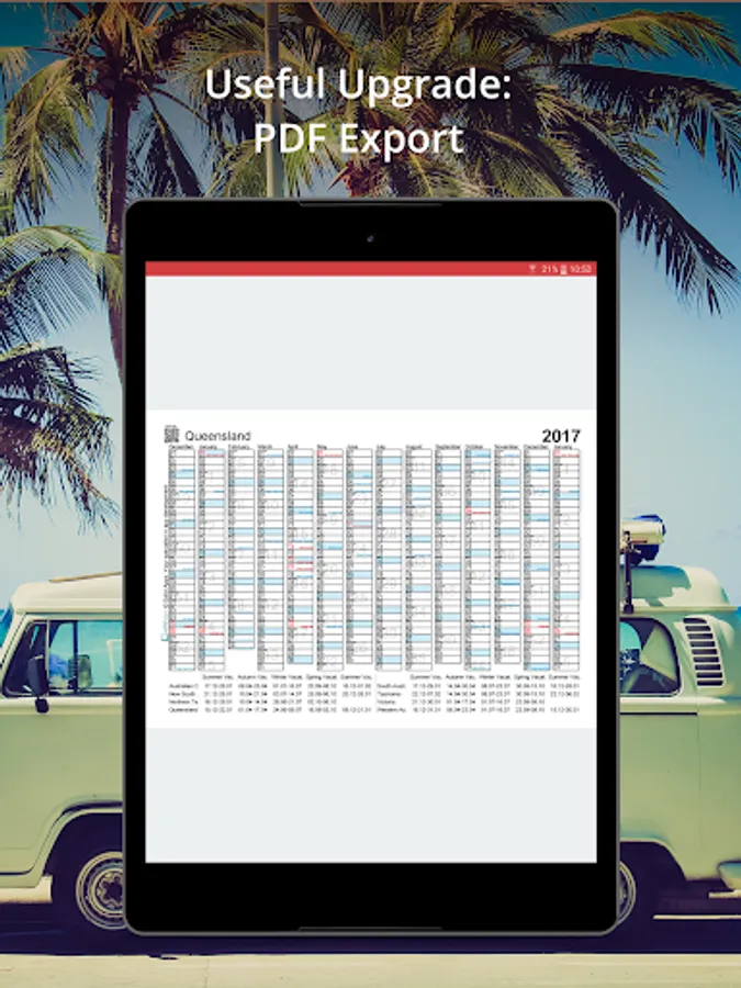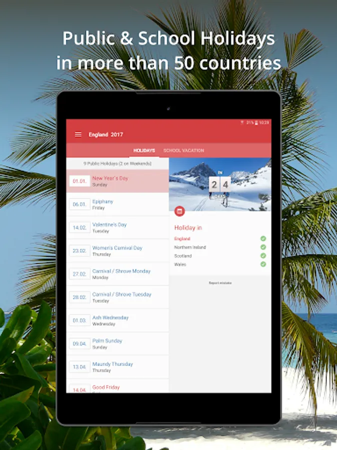 With the help of the integrated countdown you can easily keep an eye on the upcoming holidays and school vacations: just mark any future holidays you like in your overview and the app will show you how many days are left until then. This also works with every school vacation.