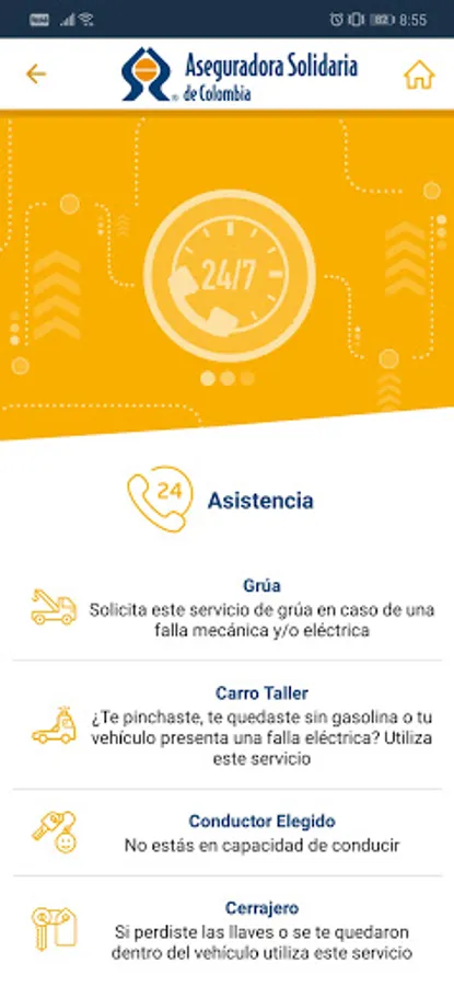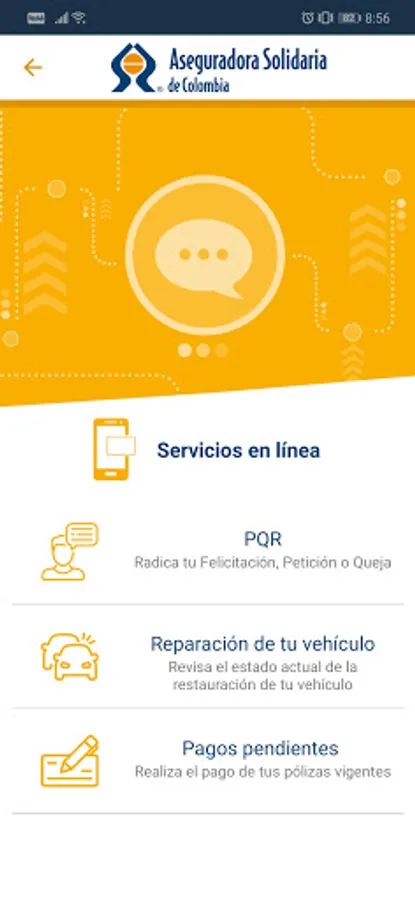 We want to always be with you, that's why we developed the new Solidaria App, so that you have some of our services; Assistance for your vehicle, online chat, follow-up to the repair of your vehicle, file and consult congratulations, requests or complaints, check the status of your insurance, online payments and support at your fingertips in an easy, accessible and flexible way .