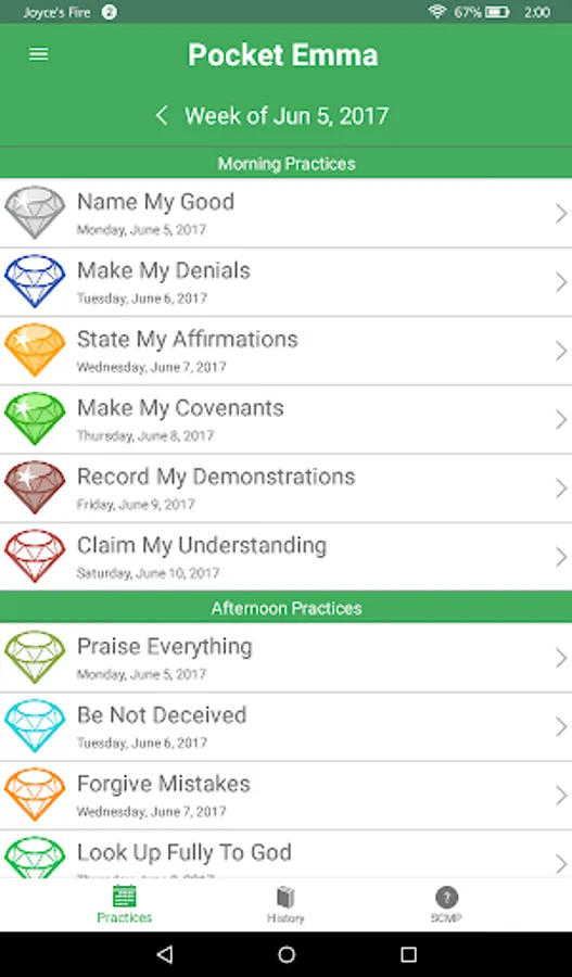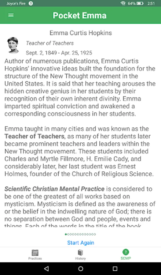 Based on the teachings of Emma Curtis Hopkins, as found in the book, “Scientific Christian Mental Practice”, this app allows the user to perform a daily spiritual practice of twelve lessons. Metaphysically, the number twelve refers to spiritual fulfillment. As we learn over and over again what these lessons have to teach us, we experience a great healing by the revelation of our wholeness. Each lesson, or gate, unlocks a power within us.