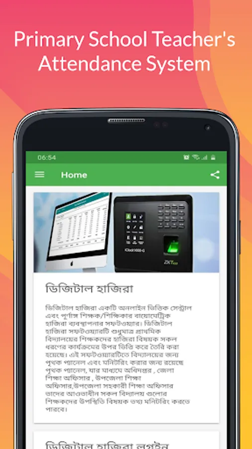 Digital Hazira is a online based complete Bio-metric Attendance System for Primary Teachers. It has separate panel for both School and monitoring department. So that the Directorate, District Education Officer, Upazila Education Officer and Assistant Upazila