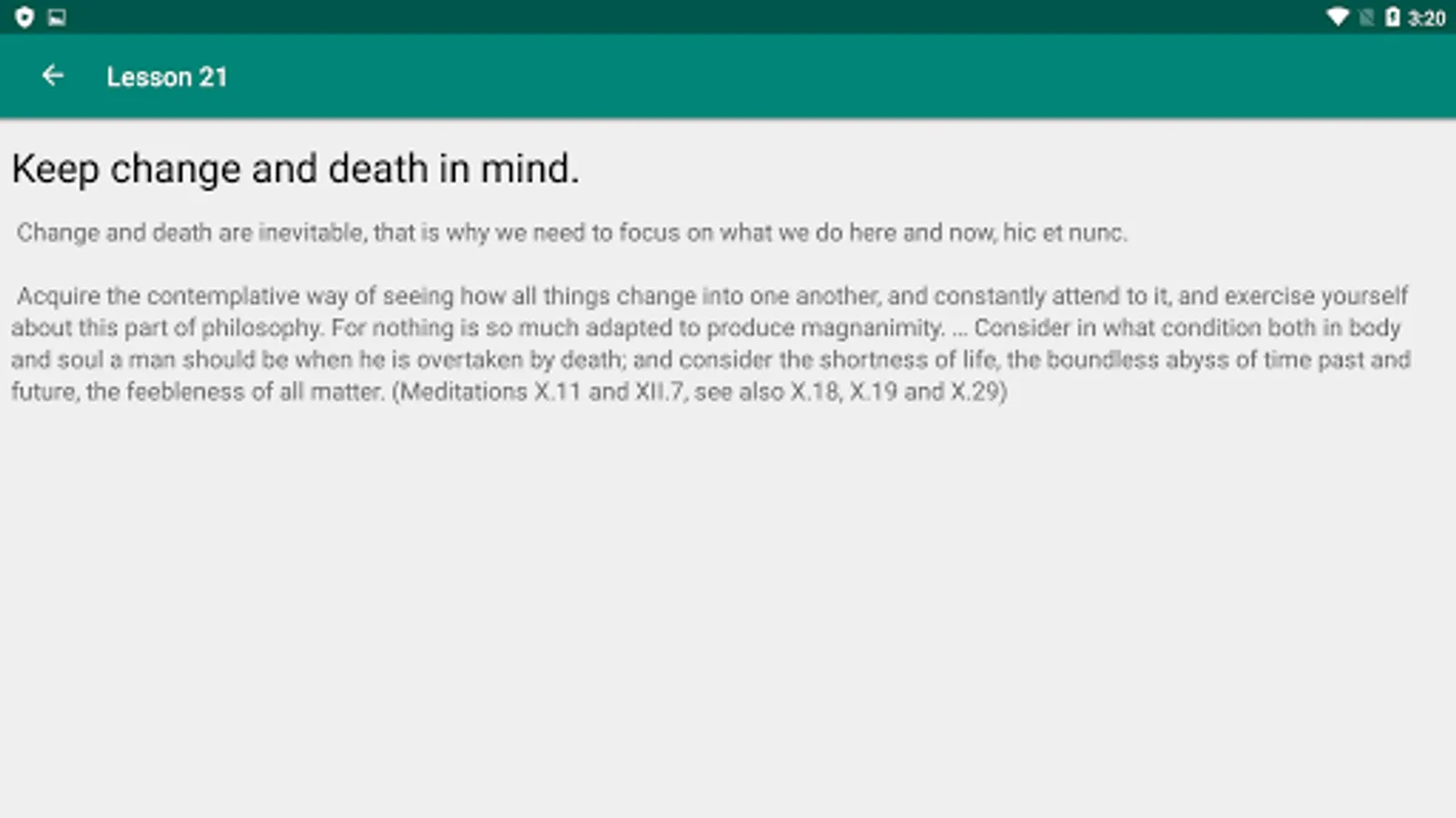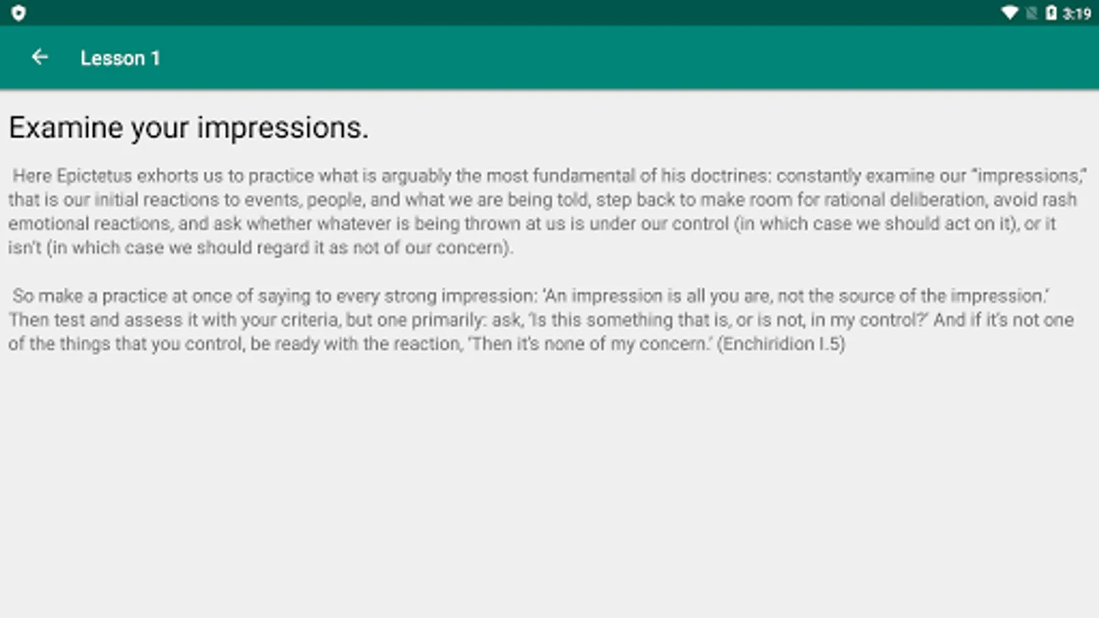 Stoicism is a practical philosophy of life. The way it is intended to organize the lessons is simply in order of appearance in the Enchiridion or the Meditations, though the same “exercise” may be referred to more than once by either author, which I will point out when appropriate. For each entry, professor Massimo gives a brief description or comment, followed by the original passage.