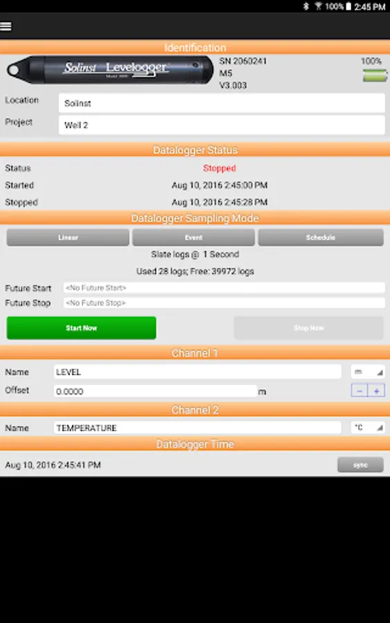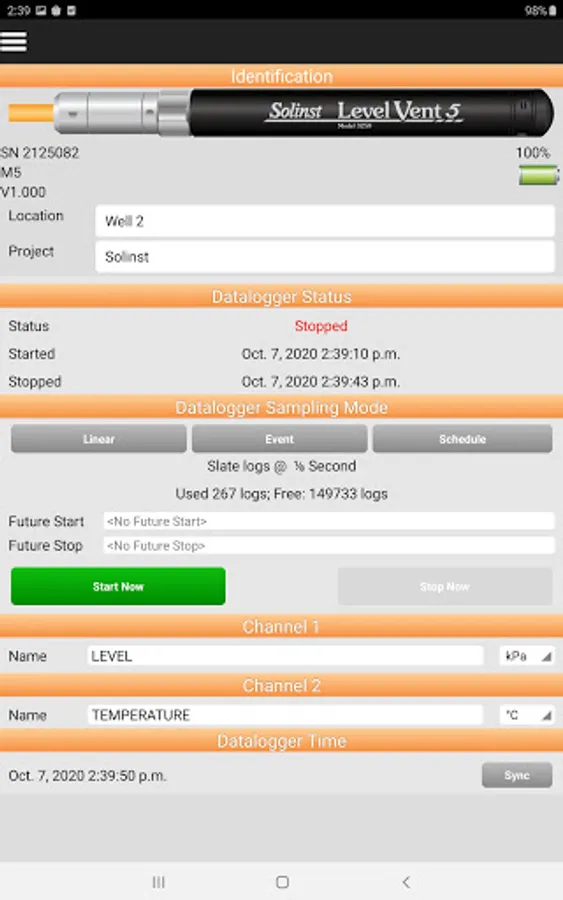 The Levelogger® 5 App Interface uses Bluetooth® wireless technology to connect a Solinst datalogger to your smartphone or tablet. Once connected, you can view data and program the datalogger using the Solinst Levelogger App.