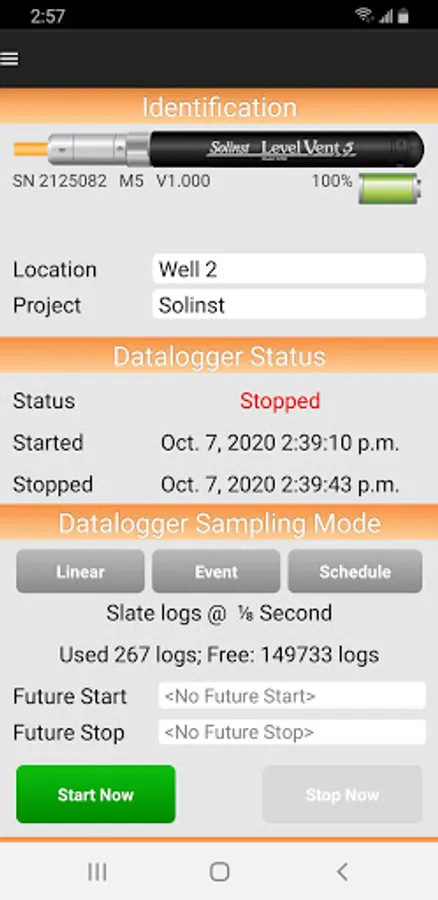 The Solinst Levelogger App is designed to communicate to Solinst dataloggers wirelessly! It has many programming options including, start/stop, data downloading, scheduled and repeat sampling, future start/stop, and GPS coordinates. Files can be sent directly from the App to any email account. In order to use the Solinst Levelogger App, you will need to purchase our Levelogger 5 App Interface, which uses a simple hardware connection to the top of a Solinst L5 Direct Read Cable, LevelVent 5 Wellhead or to an AquaVent 5 Wellhead communication cable. Your Android device communicates with the Levelogger 5 App Interface using wireless Bluetooth® technology, providing information about the connected datalogger, including battery level and serial number, and firmware. Files can be sent directly from the App to any email account, or to most File Sharing Apps already installed on your smart device.