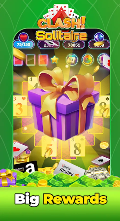 What makes Money Solitaire Clash different from regular cash solitaire is that gift cards are hidden between the poker cards in the deck and when you open these gift cards you have a chance to win cash, credits or Amazon Coins.
