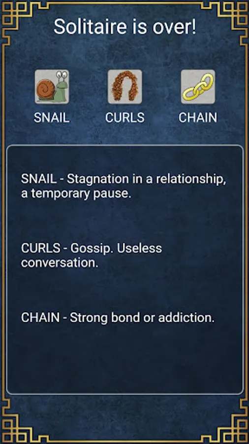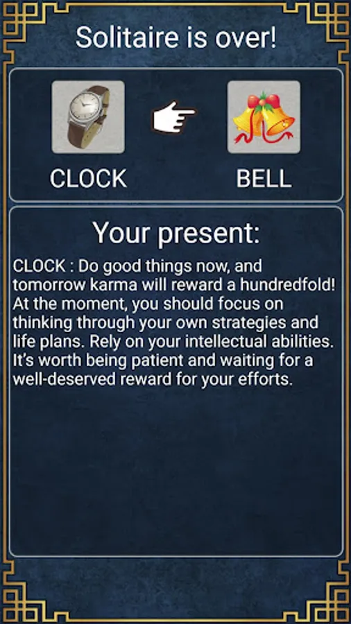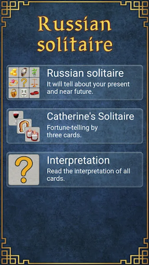 Catherine's Solitaire is a vintage version of the prediction for every day. From 40 cards 3 are randomly selected. They will give advice on a situation or upcoming event.