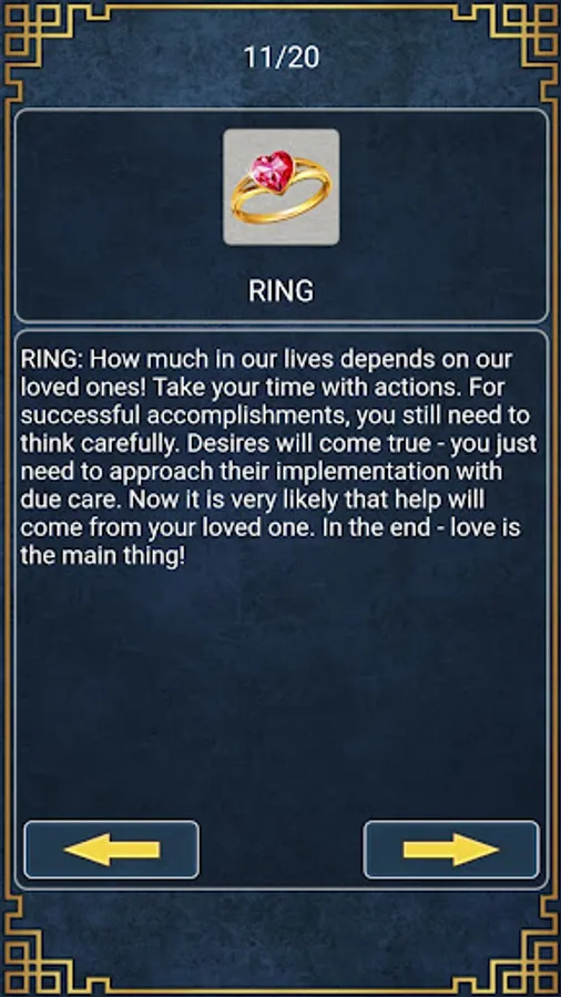 Fortune telling on small cards is an easy and quick way to predict your future. 20 cards are dealt and you need to select 2 pictures. Cards will show you your present and near future.